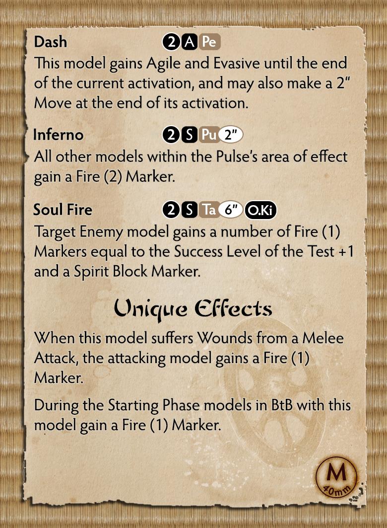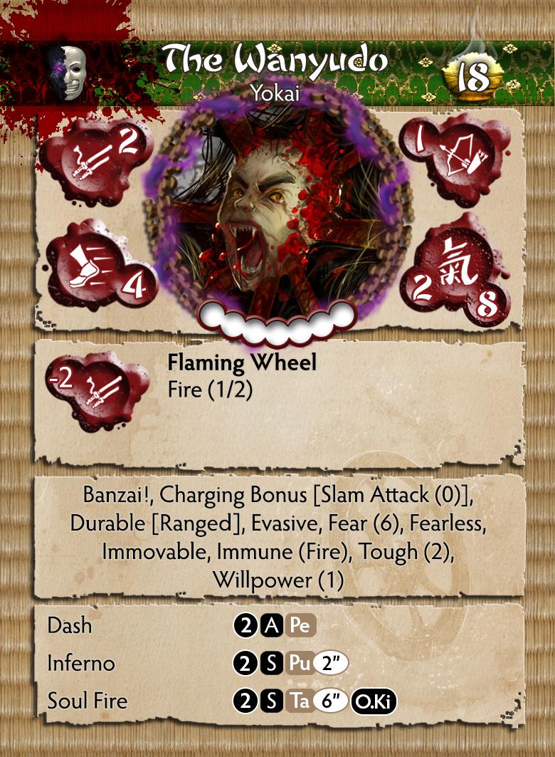 Some say the Wanyudo are a curse of those that would break the tenants of Michi. I punishment for the Samurai who fail in their duty to their ancestors and a hex of the lands they survey. What is known is that these Wanyudo are the very vision of hell itself. Rampaging across the land, those brave enough to oppose the evil Yokai must endure the wicked flames that dance out from the flaming inferno charring flesh and melting metal, cooking the would be heroes alive.