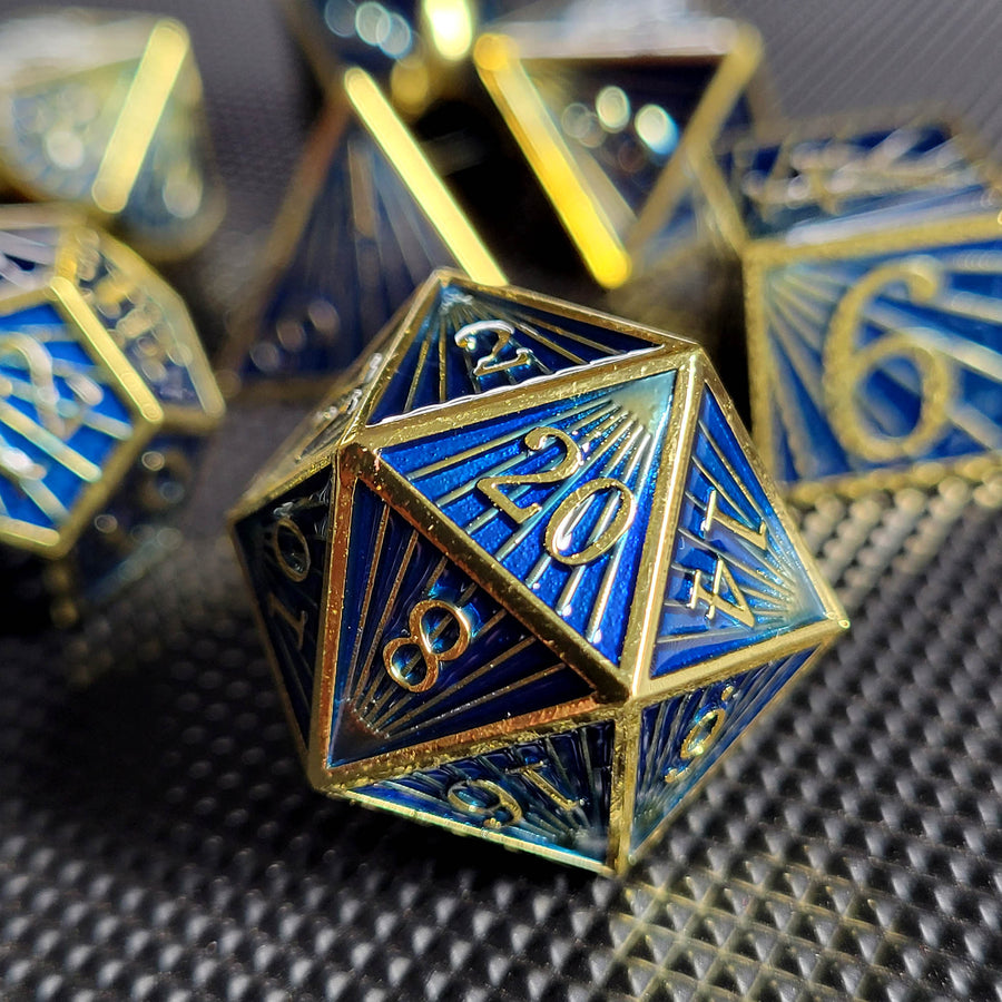 DETAILS: 7-piece polyhedral metal dice set containing a D20: 23mm, D12: 20mm, D10 (marked 00-90): 18mm, D10 (marked 0-9): 18m , D8:16mm, D6: 16mm, D4: 20mm