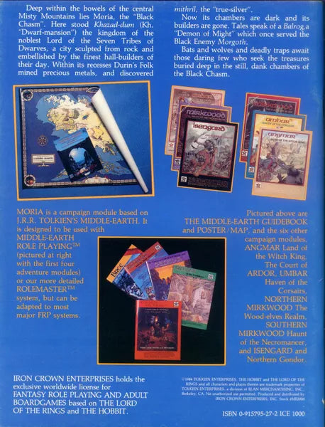 Moria: The Dwarven City is a source book for ICEs Middle Earth Role Playing Game (MERP).